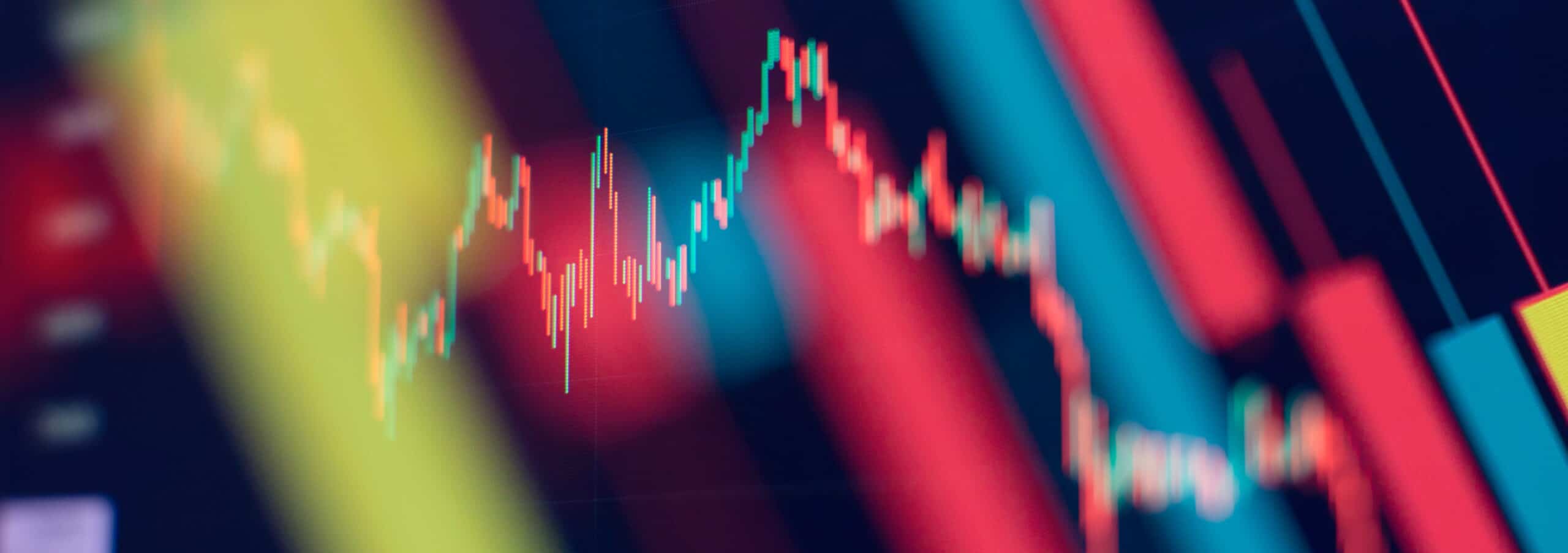 green candlesticks going up indicating crypto rising in value. Graphical representation of volumes and time intervals