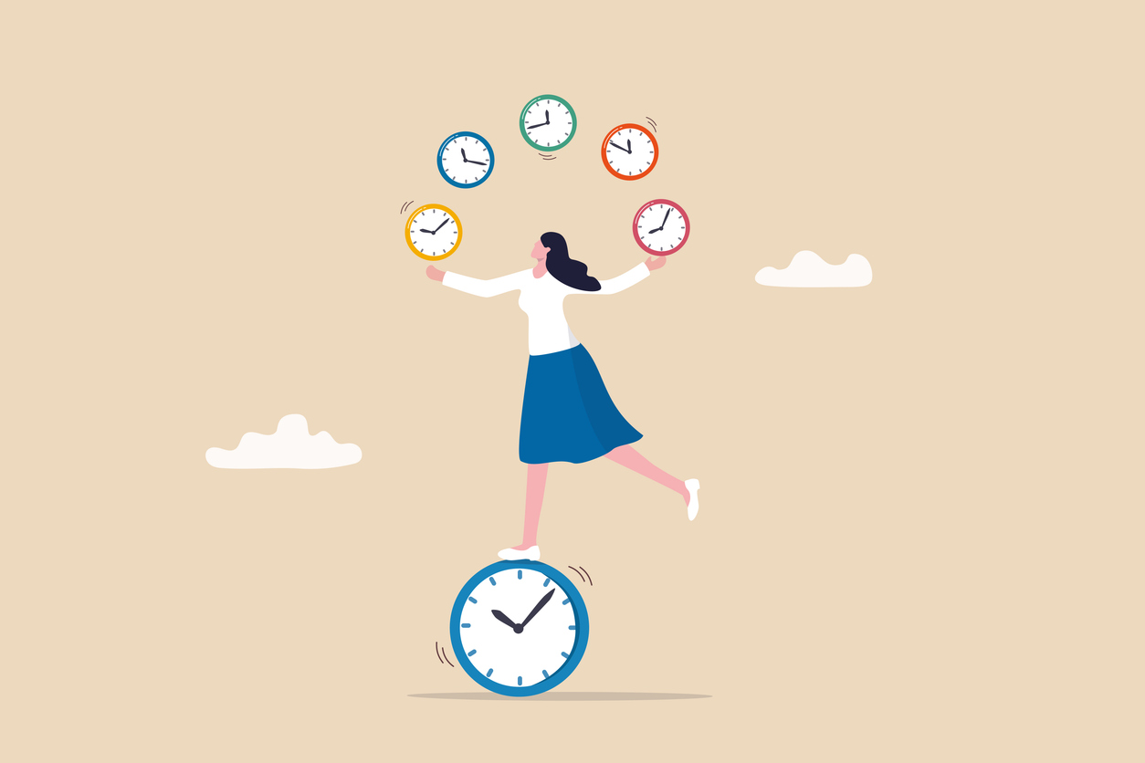 Time management for best efficiency and productivity, manage project and control timeline or schedule, speed or fast work concept, businesswoman juggling clocks and balance herself on the clock.