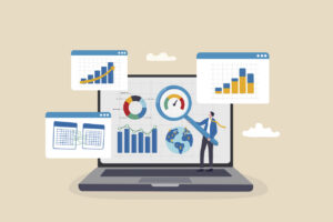 Market research data analysis, analyze business data or financial report, SEO analytics or profit and earning concept, businessman analyst with magnifying glass analyze data on computer laptop.